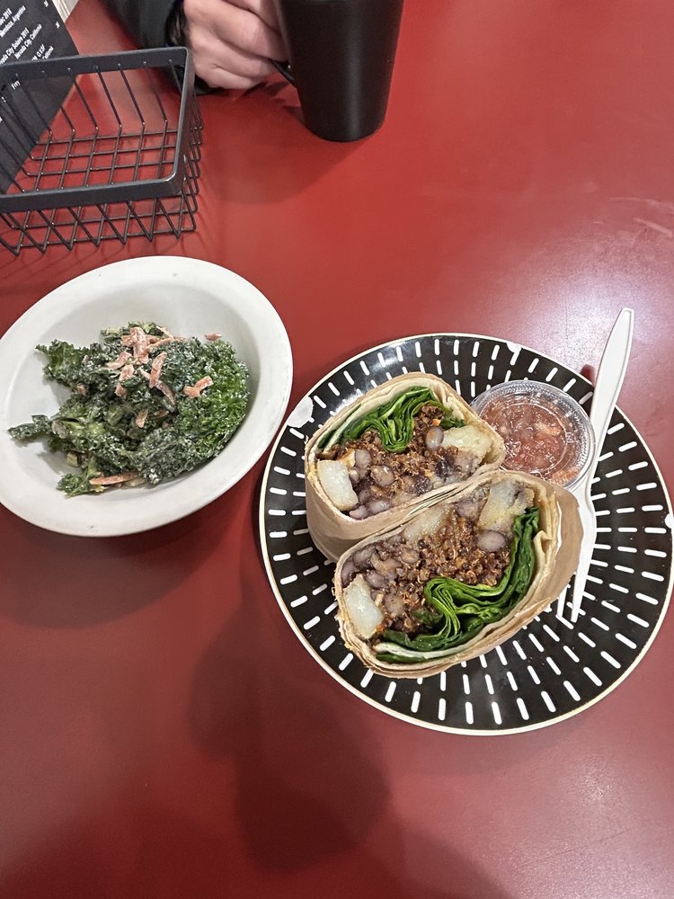 Vegan, vegetarian, or with meat if you choose. Starts at a base price, and builds from there with your choice of ingredients. Comes with side of kale cole slaw.